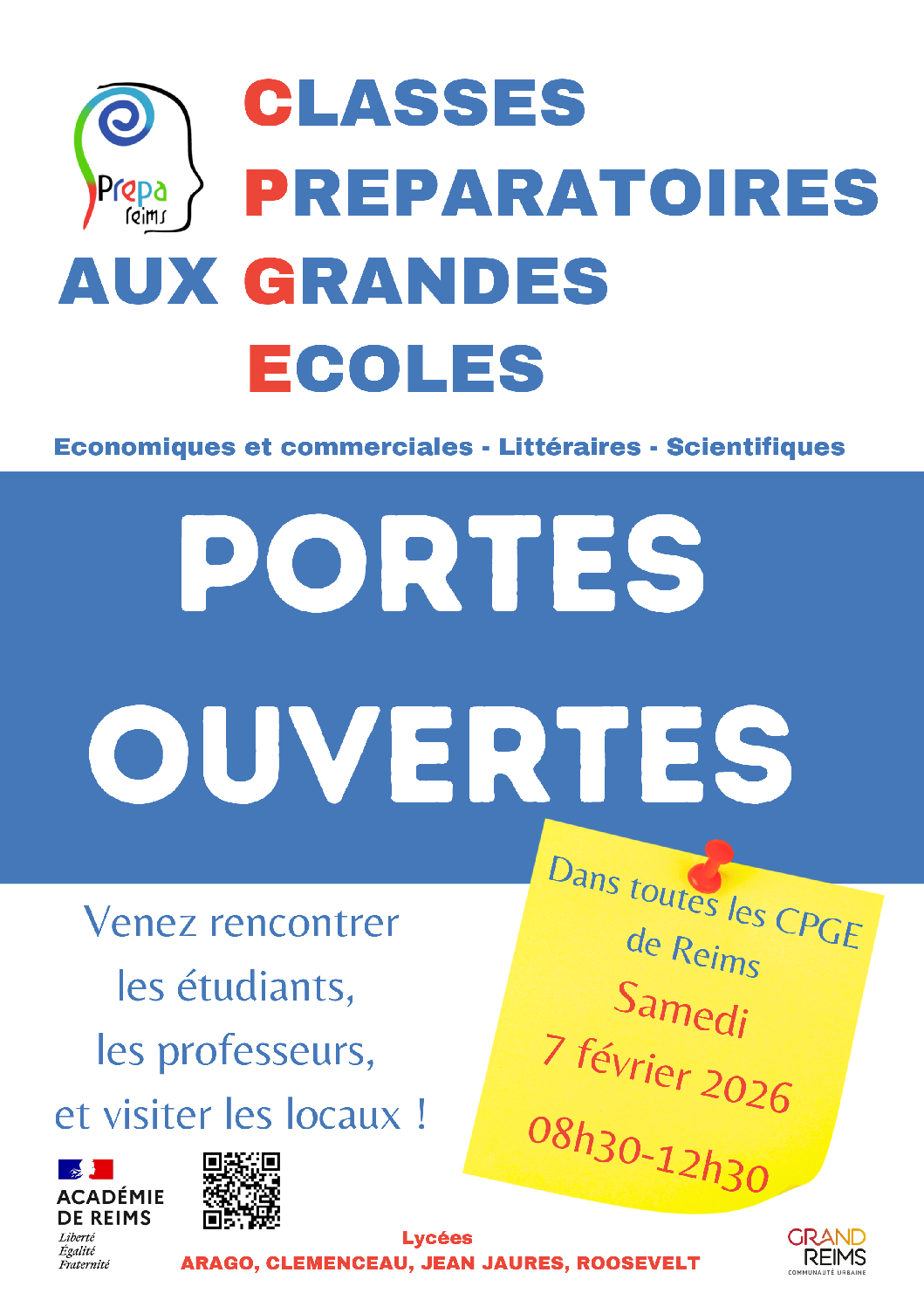 La Journée Portes Ouvertes des CPGE rémoises se déroulera le samedi 7 février 2026 entre 08h30 et 12h30 aux lycées Arago, Clemenceau, Jean Jaurès et Roosevelt. Les élèves de Seconde, de Première et de Terminale, ainsi que leurs familles, sont…